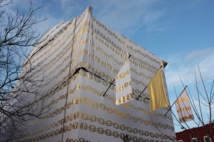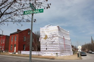 At the corner of Arsenal and Iowa sits a house, covered in gold chain emblazoned spandex. There are few windows exposed, a red ladder hangs from one side, and gold flags flap in the wind. The print design, an appropriated motif from hip-hop culture, both decorates the building surface and creates a bound or constricted feeling. The craft and execution were impeccable. This work’s sheer magnitude creates a presence in the site specific, underprivileged community. The chains can resemble the shackles of slavery, flashy jewelry, or a really gaudy towing chain and while these various readings can cause political tension, it becomes the power of the piece. It is every artist dream that viewers will see their work and think about it later. There is no questioning the effectiveness of Meksin’s project. Not only has the piece created a stir in its neighbors, but it has also generated conversations about public art regulations in St. Louis. The work was taken down this week so I regret to say that you cannot visit the work yourself.